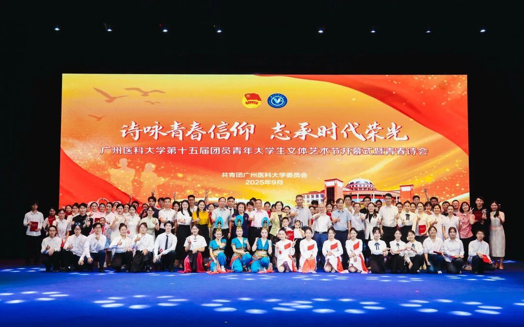 9月28日,广州医科大学第十五届团员青年大学生文体艺术节开幕式暨青春诗会于番禺校区礼堂举行。学校党委书记曾颖如、副校长周麟,关工委陈金城同志、李静娴同志,党委办公室、党委宣传部、党委学生工作部、教务处、离退休人员管理处、学校工会、学校团委负责人,各直属团组织负责人、全体团干参加活动。